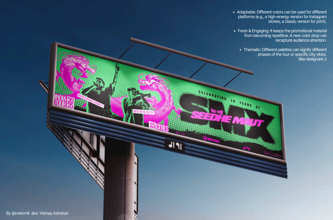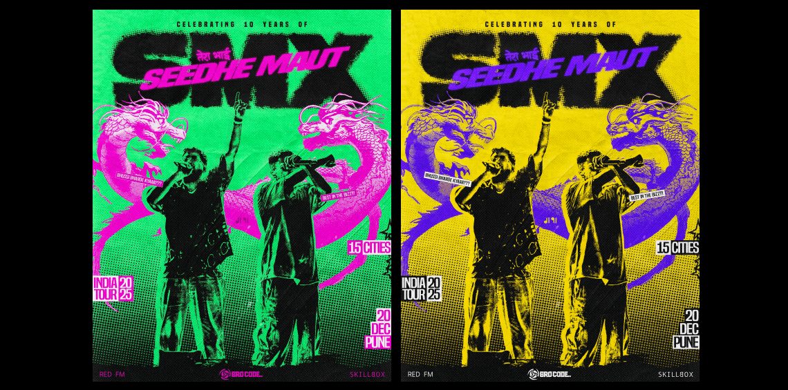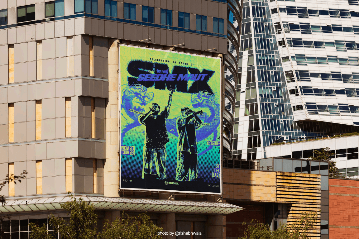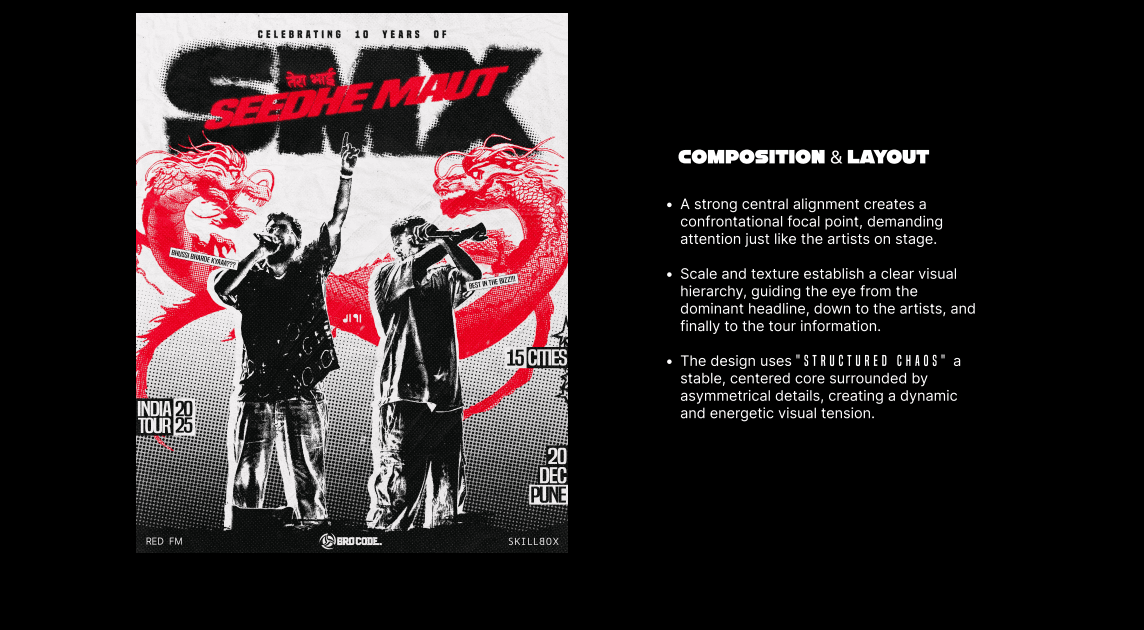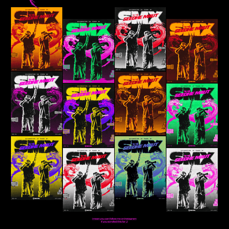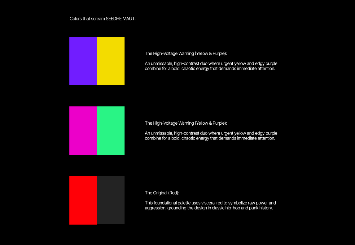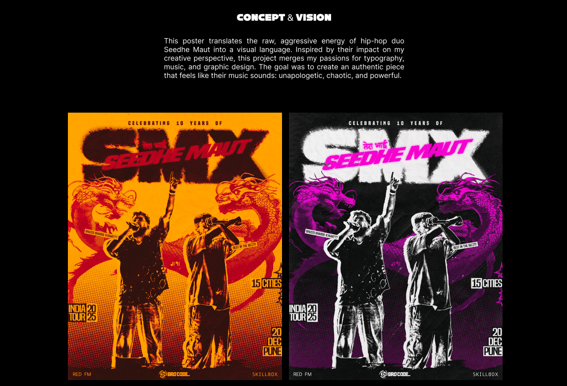 This project was never about making a poster. It was about capturing the sonic chaos of a Seedhe Maut track and detonating it visually. Vismay set out to translate their sound into raw graphic energy—where every element becomes an echo of their music.